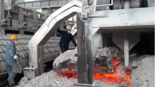 圖為:工投公司電解一車間當(dāng)班人員在打撈殘極塊