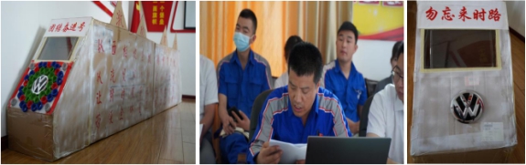 西柏坡精神是部生動的教科書,車間工人黨員袁有德利用平時裝配件的紙盒子,創(chuàng)意性地制做了一列"團結(jié)奮進號"火車,邀請黨員一起乘車前行。袁有德說:"團結(jié)奮進號"列車蘊含著學(xué)習(xí)西柏坡精神,強企富家、團結(jié)奮進的寓意,車頭前面的"大眾"標(biāo)識代表公司經(jīng)營的品牌;八個綠色的大美孚機油蓋代表八方來財,所有蓋口都向外代表招攬客戶,減少流失,而且像螺絲釘一樣牢牢釘住!車頭車尾標(biāo)有"勿忘來時路"的字樣,以此提醒廣大黨員干部不忘初心、牢記使命,一定不要忘記來時的路,回顧過去,展望未來,讓"團結(jié)奮進"號列車在西柏坡精神的感召下前行。支部要求,在疫情防控和汽車行車嚴竣的形勢下,我們每一個物產(chǎn)汽貿(mào)員工都是新時代的答卷者,讓"團結(jié)奮進號"奔馳在新時代的征程上,承載著中國夢、物產(chǎn)夢,承載著物產(chǎn)汽貿(mào)職工群眾對美好生活的向往,風(fēng)馳電掣,勇往直前,奔向未來!