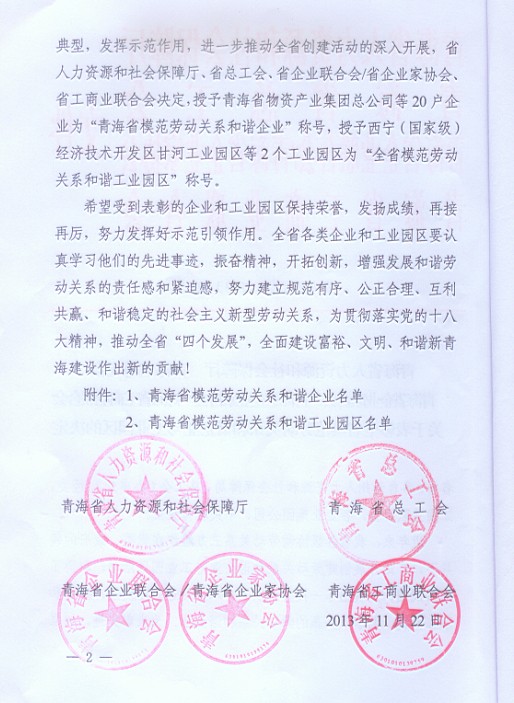 青海省物產(chǎn)集團(tuán)總公司榮獲“青海省模范勞動(dòng)關(guān)系和諧企業(yè)”稱號